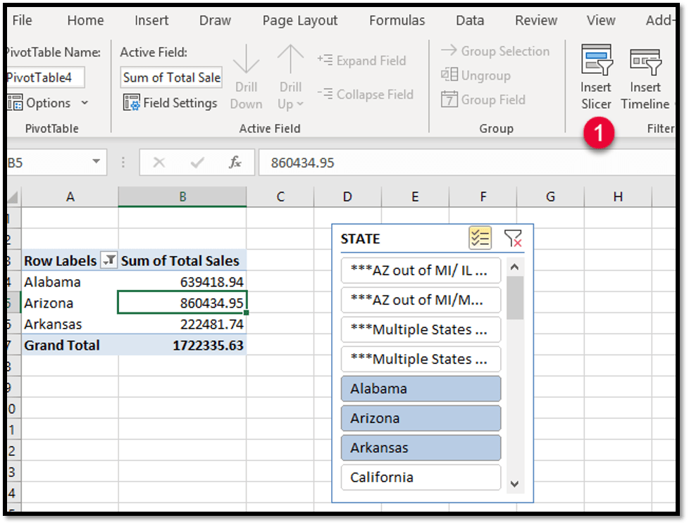 The table below shows how to easily add in a slicer to your pivot table. This allows for quick filtering vs using the filter drop down menu in a pivot table. This makes it more visible and easier for others to see and understand what is making up the data.
