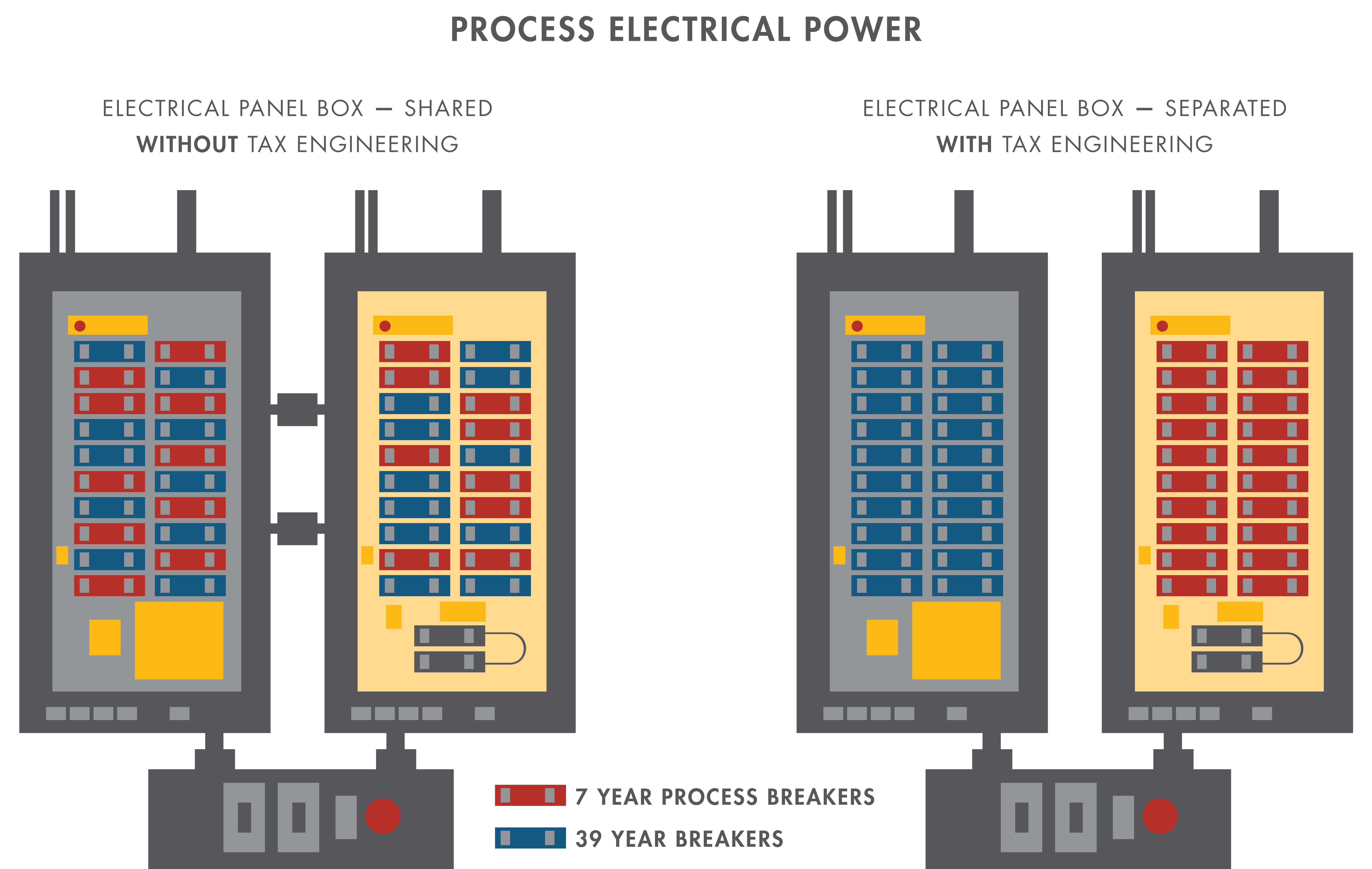 With electrical power, it’s important to separate building components from personal property. When the process electrical power is shared with the general building lighting and receptacles, the distribution panels and the conduit and wire going back to the transformer are considered 39-year property.